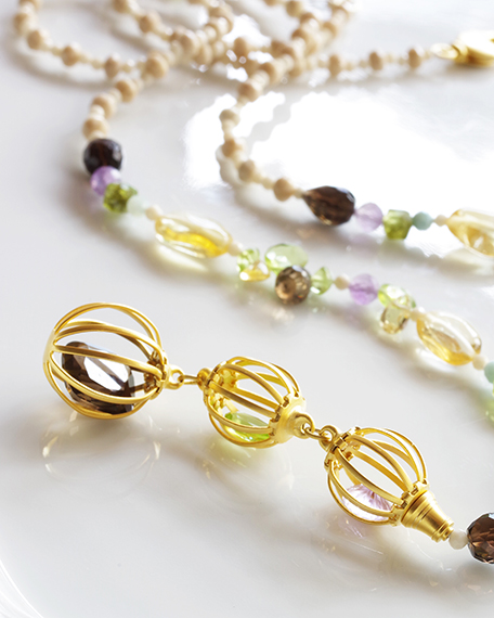 大粒のアメトリンをトップにスリーピングビューティー鉱山で採掘されたターコイズや琥珀、ペリドットなど、10種類もの上質天然石を用います。