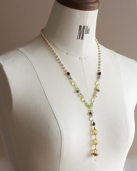 ノットの応用やめがね留めのテクニックを伝授。お揃いのブレスレット(別売)をつなげれば更にロングなネックレスとしてお使い頂けます。